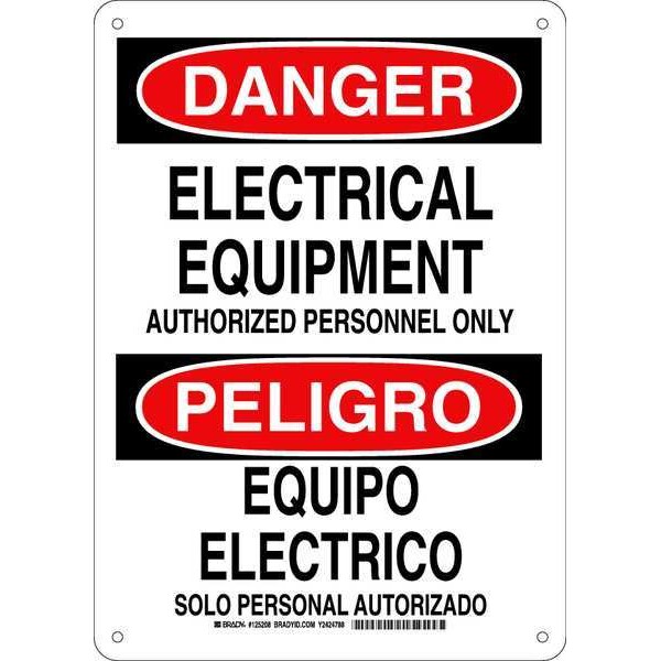 Danger Sign, Sign Subject Matter Electrical Hazard, Height 14 in, Width 10 in, Sign Material Aluminum, Sign Mounting Style With Mounting Holes, Header Danger/Peligro, Legend Electrical Equipment Authorized Personnel Only/Equipo Electrico, Printed Language English, Spanish, Sign Shape Rectangle