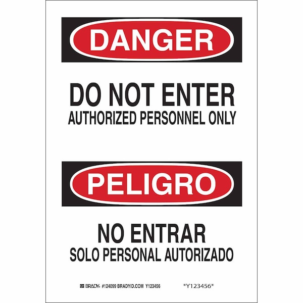 Danger Sign, Sign Subject Matter Authorized Personnel and Restricted Access, Height 14 in, Width 10 in, Sign Material Plastic, Sign Mounting Style With Mounting Holes, Header Danger/Peligro, Legend Do Not Enter Authorized Personnel Only/No Entrar Solo Personal Autorizado, Printed Language English, Spanish, Sign Shape Rectangle