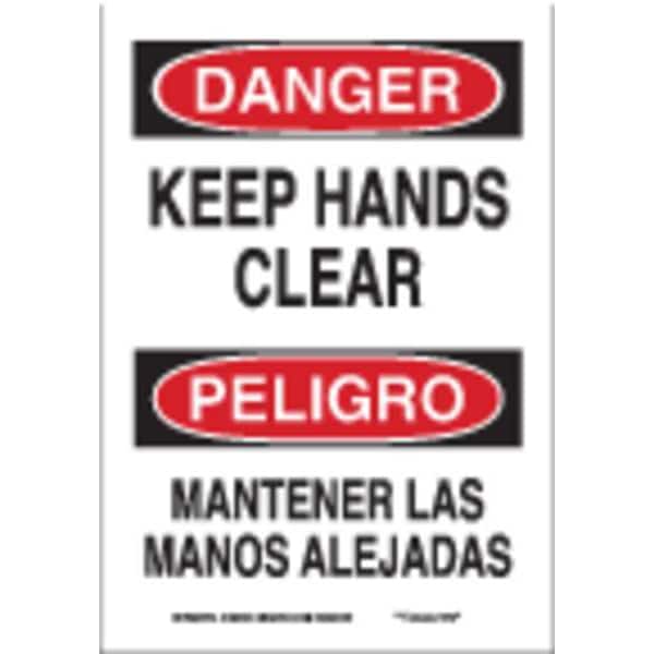 Danger Sign, Sign Subject Matter Keep Hands Clear, Height 14 in, Width 10 in, Sign Material Plastic, Sign Mounting Style With Mounting Holes, Header Danger/Peligro, Legend Keep Hands Clear/Mantener Las Manos Alejadas, Printed Language English, Spanish, Sign Shape Rectangle
