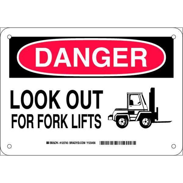 Danger Sign, Sign Subject Matter Lift Truck Traffic, Height 7 In., Width 10 In., Sign Material Aluminum, Sign Mounting Style With Mounting Holes, Header Danger, Legend Look Out For Fork Lifts, Printed Language English, Sign Shape Rectangle