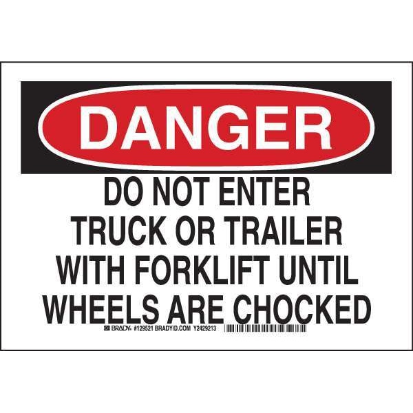 Danger Sign, Sign Subject Matter Chock Wheels, Height 7 In., Width 10 In., Sign Material Polyester, Sign Mounting Style Adhesive Surface, Header Danger, Legend Do Not Enter Truck Or Trailer With Forklift Until Wheels Are Chocked, Printed Language English, Sign Shape Rectangle