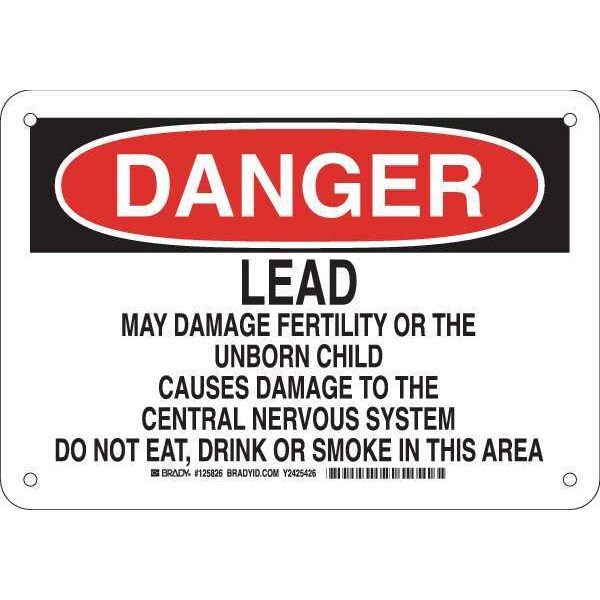 Danger Sign, Sign Subject Matter Chemical, Gas or Hazardous Materials, Height 7 in, Width 10 in, Sign Material Aluminum, Sign Mounting Style With Mounting Holes, Header Danger, Legend Lead May Damage Fertility Or The Unborn Child Causes Damage To The Central Nervous System Do Not Eat, Drink Or Smoke In This Area, Printed Language English, Sign Shape Rectangle