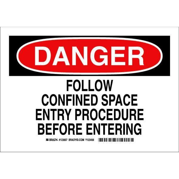 Danger Sign, Sign Subject Matter Confined Space, Height 7 in, Width 10 in, Sign Material Polyester, Sign Mounting Style Adhesive Surface, Header Danger, Legend Follow Confined Space Entry Procedure Before Entering, Printed Language English, Sign Shape Rectangle