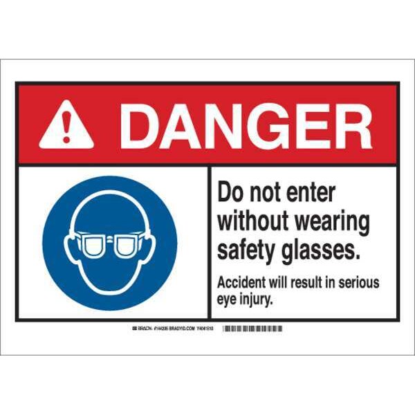 Danger Sign, Sign Subject Matter Personal Protection, Height 7 in, Width 10 in, Sign Material Polyester, Sign Mounting Style Adhesive Surface, Header Danger, Legend Do Not Enter Without Wearing Safety Glasses. Accident Will Result In Serious Eye Injury., Printed Language English, Sign Shape Rectangle
