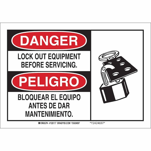 Danger Sign, Sign Subject Matter Lockout Tagout, Height 7 in, Width 10 in, Sign Material Polyester, Sign Mounting Style Adhesive Surface, Header Danger/Peligro, Legend Lock Out Equipment Before Servicing/Bloquear El Equipo Antes De Dar Mantenimiento, Printed Language English, Spanish, Sign Shape Rectangle