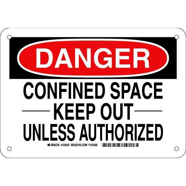 Danger Sign, Sign Subject Matter Confined Space, Height 7 in, Width 10 in, Sign Material Aluminum, Sign Mounting Style With Mounting Holes, Header Danger, Legend Confined Space -----Keep Out----- Unless Authorized, Printed Language English, Sign Shape Rectangle