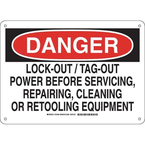 Danger Sign, Sign Subject Matter Lockout Tagout, Height 10 in, Width 14 in, Sign Material Aluminum, Sign Mounting Style With Mounting Holes, Header Danger, Legend Lock-Out/Tag-Out Power Before Servicing, Repairing, Cleaning Or Retooling Equipment, Printed Language English, Sign Shape Rectangle