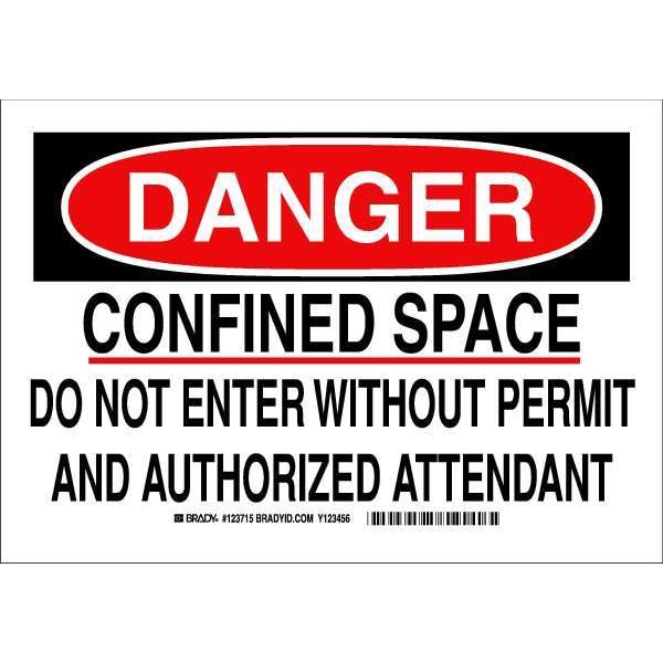 Danger Sign, Sign Subject Matter Confined Space, Height 7 in, Width 10 in, Sign Material Polyester, Sign Mounting Style Adhesive Surface, Header Danger, Legend Confined Space Do Not Enter Without Permit And Authorized Attendant, Printed Language English, Sign Shape Rectangle