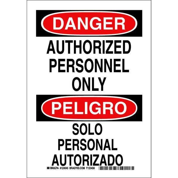 Danger Sign, Sign Subject Matter Authorized Personnel and Restricted Access, Height 10 in, Width 7 in, Sign Material Polyester, Sign Mounting Style Adhesive Surface, Header Danger/Peligro, Legend Authorized Personnel Only/Solo Personal Autorizado, Printed Language English, Spanish, Sign Shape Rectangle