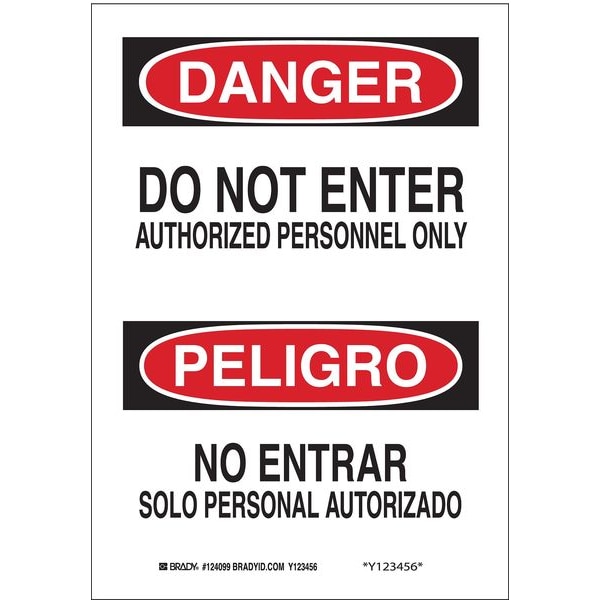 Danger Sign, Sign Subject Matter Authorized Personnel and Restricted Access, Height 14 in, Width 10 in, Sign Material Polyester, Sign Mounting Style Adhesive Surface, Header Danger/Peligro, Legend Do Not Enter Authorized Personnel Only/No Entrar Solo Personal Autorizado, Printed Language English, Spanish, Sign Shape Rectangle
