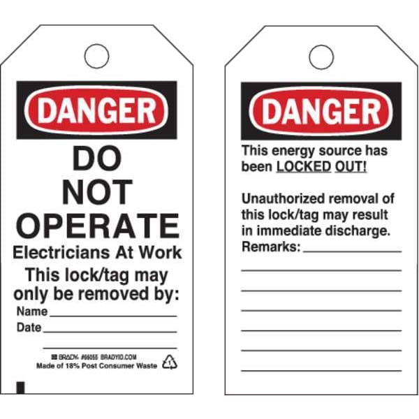 Danger Tag, Front Side Legend Danger Do Not Operate, Header Danger, Language English, Legend Type Text, Mount Type Nylon Ties, Number of Printed Sides 2, Overall Height 5 3/4 in, Overall Width 3 in, Reverse Side Legend This Energy Source is Locked Out, Sign Background Color White, Sign Material Heavy Duty Polyester, Sign Out Sections Date, Name, Remarks, Signage Type Tag, Write-On Surface Yes, For Location Indoor, Outdoor, For Use With Lockout Tagout, Grommet Material Metal