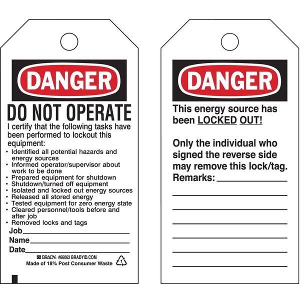 Danger Tag, Front Side Legend Danger Do Not Operate, Header Danger, Language English, Legend Type Text, Mount Type Nylon Ties, Number of Printed Sides 2, Overall Height 5 3/4 in, Overall Width 3 in, Reverse Side Legend This Energy Source is Locked Out, Sign Background Color White, Sign Material Heavy Duty Polyester, Sign Out Sections Remarks, Signage Type Tag, Write-On Surface Yes, For Location Indoor, Outdoor, For Use With Tagout Device, Grommet Material Metal