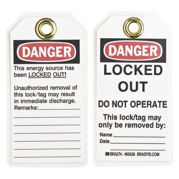 Danger Tag, Front Side Legend Locked Out Device, Header Danger, Language English, Legend Type Text, Mount Type Nylon Ties, Number of Printed Sides 2, Overall Height 5 3/4 in, Overall Width 3 in, Reverse Side Legend This Energy Source is Locked Out, Sign Background Color White, Sign Material Heavy Duty Polyester, Sign Out Sections Date, Name, Remarks, Signage Type Tag, Write-On Surface Yes, For Location Indoor, Outdoor, For Use With Tagout Device, Grommet Material Metal