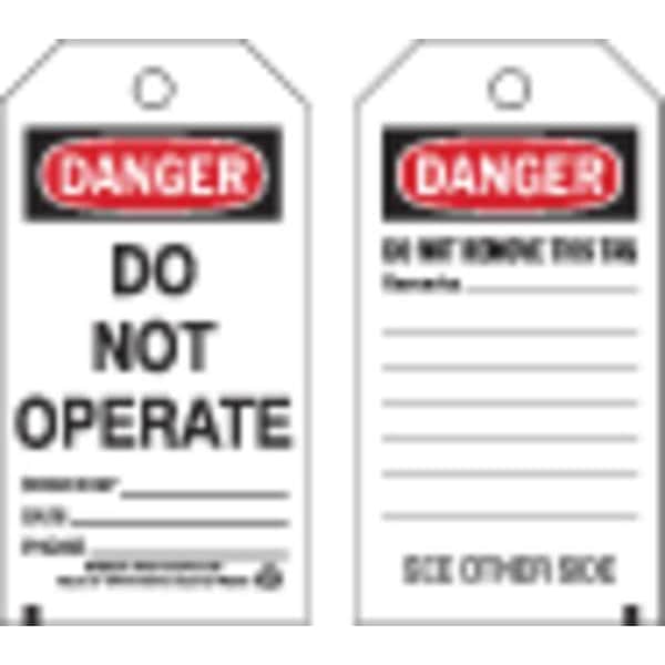 Danger Tag, Front Side Legend Danger Do Not Operate, Header Danger, Language English, Legend Type Text, Mount Type Nylon Ties, Number of Printed Sides 2, Overall Height 5 3/4 in, Overall Width 3 in, Reverse Side Legend Do Not Remove Tag, Sign Background Color White, Sign Material Polyester, Sign Out Sections Remarks, Signage Type Tag, Write-On Surface Yes, For Location Outdoor, For Use With General Equipment, Grommet Material Metal, Header Background Color Black/Red/White