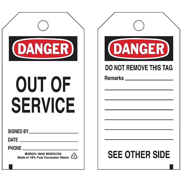 Tag, Compatible Tag Holder Mfr Part Number Not Applicable, Compatible Tag Insert Mfr Part Number Not Applicable, Fastener Attachment Length 7 in, Fastener Type Nylon Tie, Header Wording (Reverse Side) Danger, Header Wording Danger, Height 5 3/4 in, Indoor/Outdoor Usage Outdoor, Lamination Type Self-Laminating, Language English, Mounting Hole Reinforcement Type Metal, Mounting Hole Size 3/8 in, Number of Tags 10, Preprinted Legend Out of Service Signed By___Date___Phone___