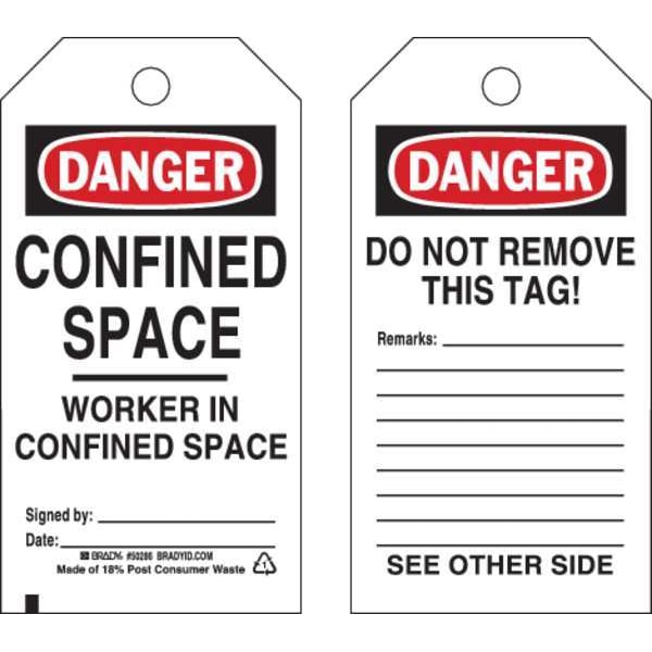 Danger Tag, Subject Matter Confined Space, Sign Legend Confined Space Worker In Confined Space Signed By: Date:, Legend Same on Both Sides No, Sign Header Danger, Shape Rectangular, Safety Tag Legend - Back Side Do Not Remove This Tag Remarks:, Sign Header -Back Side Danger, Package Quantity 25