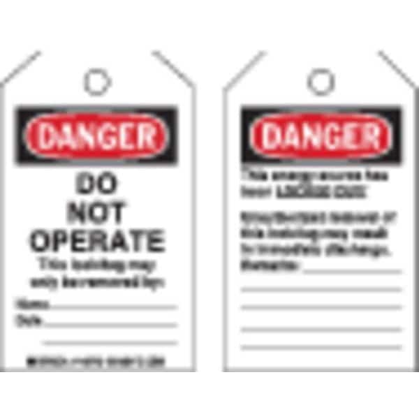 Danger Tag, Front Side Legend Danger Do Not Operate, Header Danger, Language English, Legend Type Text, Mount Type Nylon Ties, Number of Printed Sides 2, Overall Height 5 in, Overall Width 3 in, Reverse Side Legend This Energy Source is Locked Out, Sign Background Color White, Sign Material Polypropylene, Sign Out Sections Date, Name, Signage Type Tag, Write-On Surface Yes, For Use With Lockout Tagout, Grommet Material No Grommet, Header Background Color Black/Red/White, Header Text Color White