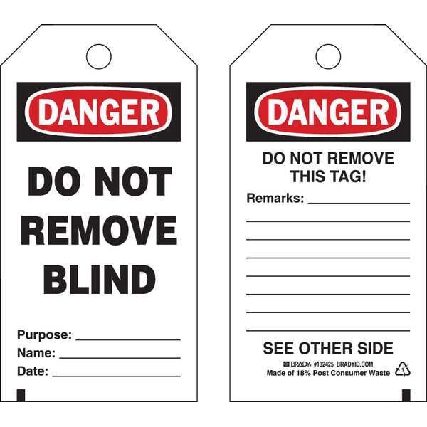 Danger Tag, Front Side Legend DO NOT REMOVE BLIND PURPOSE___NAME___DATE___, Header Danger, Language English, Legend Type Text, Mount Type Nylon Ties, Number of Printed Sides 2, Overall Height 5 3/4 in, Overall Width 3 in, Reverse Side Legend Do Not Remove Tag, Sign Background Color White, Sign Material Polyester, Sign Out Sections Date, Name, Purpose, Remarks, Signage Type Tag, Write-On Surface Yes, For Location Outdoor, For Use With General Equipment, Grommet Material Metal