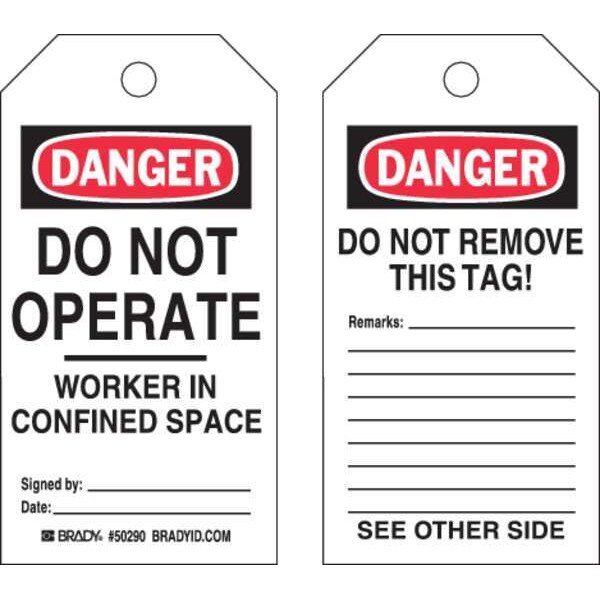 Danger Tag, Subject Matter Machine and Operational, Sign Legend Do Not Operate Worker In Confined Space Signed By: Date:, Legend Same on Both Sides No, Sign Header Danger, Shape Rectangular, Safety Tag Legend - Back Side Do Not Remove This Tag Remarks:, Sign Header -Back Side Danger, Package Quantity 25