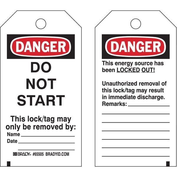 Danger Tag, Front Side Legend Do Not Remove Tag, Header Danger, Language English, Legend Type Text, Mount Type Grommet, Number of Printed Sides 2, Overall Height 5 3/4 in, Overall Width 3 in, Reverse Side Legend This Energy Source is Locked Out, Sign Background Color White, Sign Material Heavy Duty Polyester, Sign Out Sections Date, Name, Remarks, Signage Type Tag, Write-On Surface Yes, For Location Indoor, Outdoor, For Use With Tagout Device, Grommet Material Metal
