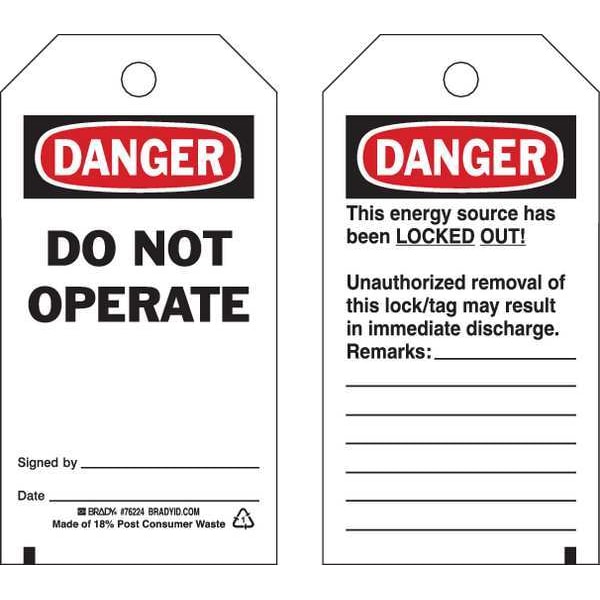 Danger Tag, Front Side Legend Danger Do Not Operate, Header Danger, Language English, Legend Type Text, Mount Type Nylon Ties, Number of Printed Sides 2, Overall Height 5 3/4 in, Overall Width 3 in, Reverse Side Legend This Energy Source is Locked Out, Sign Background Color White, Sign Material Polyester, Sign Out Sections Date, Remarks, Signed By, Signage Type Tag, Write-On Surface Yes, For Location Outdoor, For Use With Lockout Tagout, Grommet Material Metal