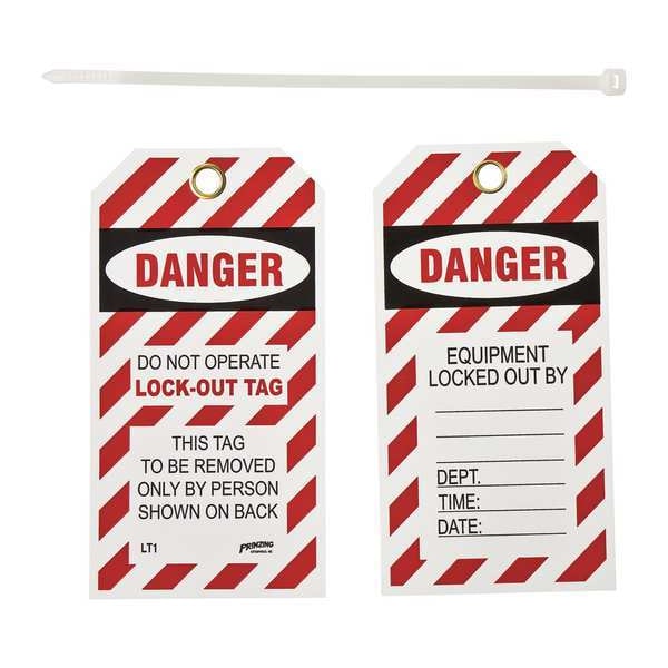 Danger Tag, Front Side Legend Danger Do Not Operate, Header Danger, Language English, Legend Type Text, Mount Type Nylon Ties, Number of Printed Sides 2, Overall Height 5 5/8 in, Overall Width 3 in, Reverse Side Legend Equipment Locked Out By Dept. Time___Date___, Sign Background Color White, Sign Material Polyester, Sign Out Sections Date, Dept, Equipment Locked Out By, Time, Signage Type Tag, Write-On Surface Yes, For Location Outdoor, For Use With Lockout Tagout, Grommet Material Brass