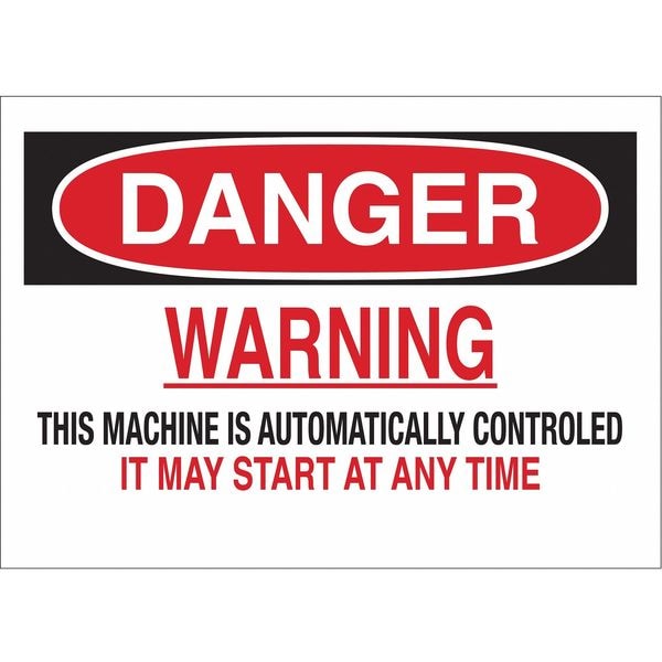 Danger Sign, Sign Subject Matter Machine and Operational, Height 10 In., Width 14 In., Sign Material Plastic, Sign Mounting Style With Mounting Holes, Header Danger, Legend Warning This Machine Is Automatically Controlled It May Start At Any Time, Printed Language English, Sign Shape Rectangle