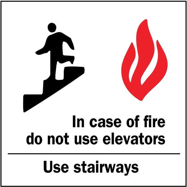 Directional Sign, Plastic, 10 in W, 7 in H, In Case Of Fire Do Not Use Elevators.Etc., White