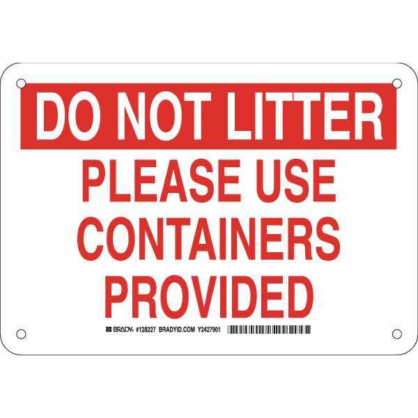 Facility Sign, Sign Subject Matter Cleaning and Maintenance, Height 7 In., Width 10 In., Sign Material Plastic, Sign Mounting Style With Mounting Holes, Header Do Not Litter, Legend Please Use Containers Provided, Printed Language English, Sign Shape Rectangle