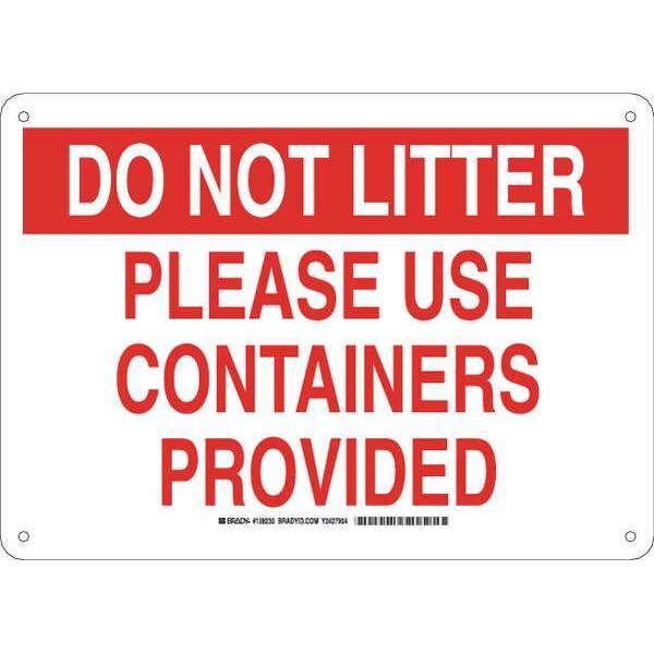 Facility Sign, Sign Subject Matter Cleaning and Maintenance, Height 10 In., Width 14 In., Sign Material Plastic, Sign Mounting Style With Mounting Holes, Header Do Not Litter, Legend Please Use Containers Provided, Printed Language English, Sign Shape Rectangle