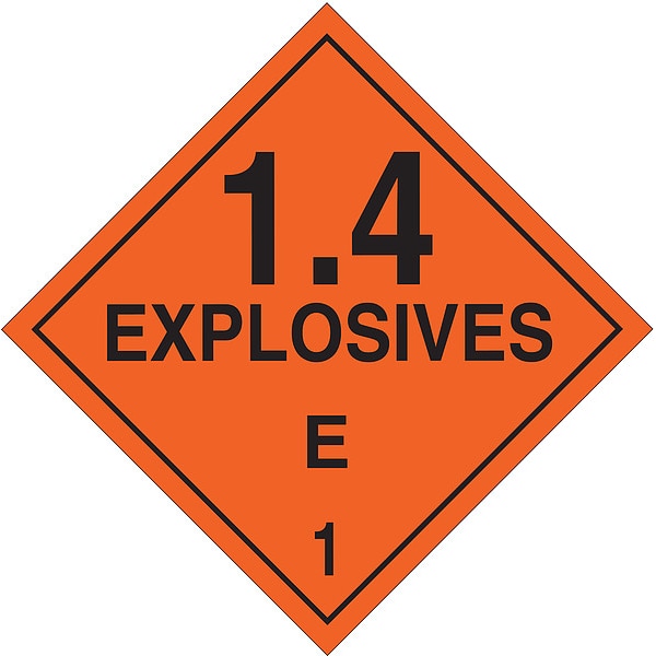 DOT Container Placard, Language English, Container Label/Placard Type Hazardous Class, Hazard Class Class 1 (Explosives), DOT/UN Product Form Placard, Message 1.4 Explosives E 1, Label Width 10 3/4 in, Label Height 10 3/4 in, Material B-101 Polycoated Tagstock