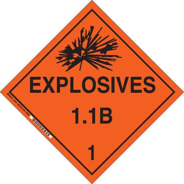 DOT Container Placard, Language English, Container Label/Placard Type Hazardous Class, Hazard Class Class 1 (Explosives), DOT/UN Product Form Placard, Message Explosives 1.1 B 1, Label Width 10 3/4 in, Label Height 10 3/4 in, Material B-101 Polycoated Tagstock