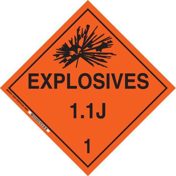 DOT Container Placard, Language English, Container Label/Placard Type Hazardous Class, Hazard Class Class 1 (Explosives), DOT/UN Product Form Placard, Message Explosives 1.1 J 1, Label Width 10 3/4 in, Label Height 10 3/4 in, Material B-101 Polycoated Tagstock