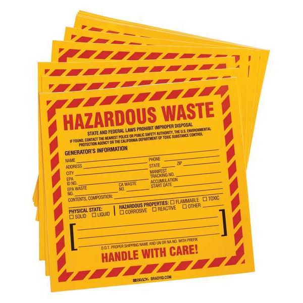 DOT Handling Label, Language English, Handling Label/Placard Type Waste, DOT/UN Product Form Label, Message State and Federal Laws Prohibit Improper Disposal, If Found, Contact the Nearest Police or Public Safety Authority or The U.S. Environmental Protection Agency or The California Department of Toxic Substance Control; Generator's Information:; Physical Stat, Label Width 6 in, Label Height 6 in, Material Vinyl, Labels per Roll 50, Background Color Yellow, Package Quantity 50
