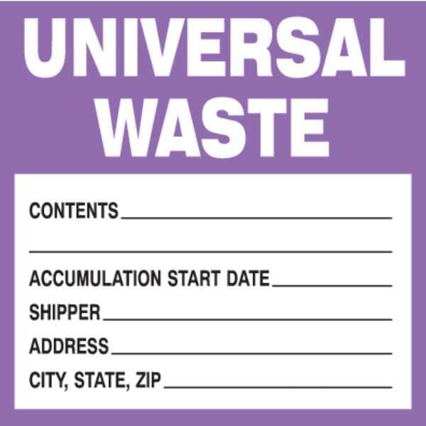 DOT Handling Label, Language English, Handling Label/Placard Type Waste, DOT/UN Product Form Label, Message Universal Waste, Label Width 6 in, Label Height 6 in, Material Paper, Labels per Roll 100, Background Color White, Package Quantity 100