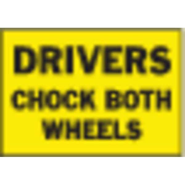Sign, Sign Subject Matter Chock Wheels, Height 10 In., Width 14 In., Sign Material Vinyl, Sign Mounting Style Adhesive Surface, Header No Header, Legend Drivers Chock Both Wheels, Printed Language English, Sign Shape Rectangle