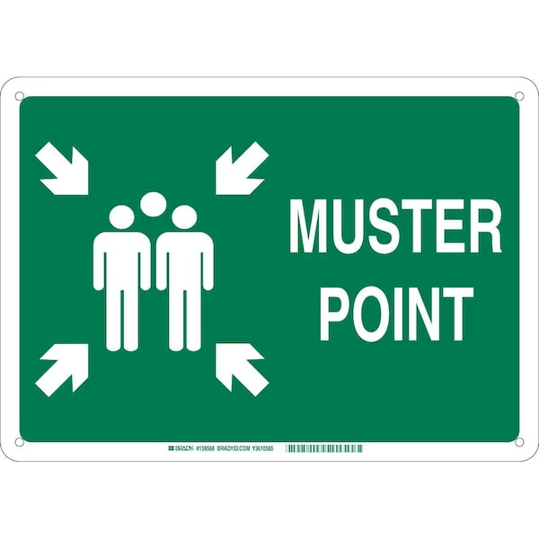 Emergency Assembly Sign, Sign Subject Matter Evacuation, Assembly or Shelter, Height 10 in, Width 14 in, Sign Material Plastic, Sign Mounting Style With Mounting Holes, Header No Header, Legend Muster Point, Printed Language English, Sign Shape Rectangle