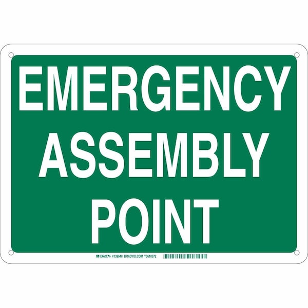 Emergency Assembly Sign, Sign Subject Matter Evacuation, Assembly or Shelter, Height 10 in, Width 14 in, Sign Material Plastic, Sign Mounting Style With Mounting Holes, Header No Header, Legend Emergency Assembly Point, Printed Language English, Sign Shape Rectangle