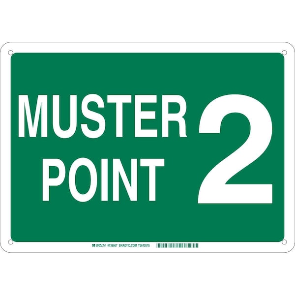 Emergency Assembly Sign, Sign Subject Matter Evacuation, Assembly or Shelter, Height 10 in, Width 14 in, Sign Material Plastic, Sign Mounting Style With Mounting Holes, Header No Header, Legend Muster Point 2, Printed Language English, Sign Shape Rectangle