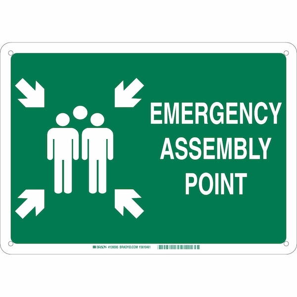 Emergency Assembly Sign, Sign Subject Matter Evacuation, Assembly or Shelter, Height 10 in, Width 14 in, Sign Material Fiberglass, Sign Mounting Style With Mounting Holes, Header No Header, Legend Emergency Assembly Point, Printed Language English, Sign Shape Rectangle