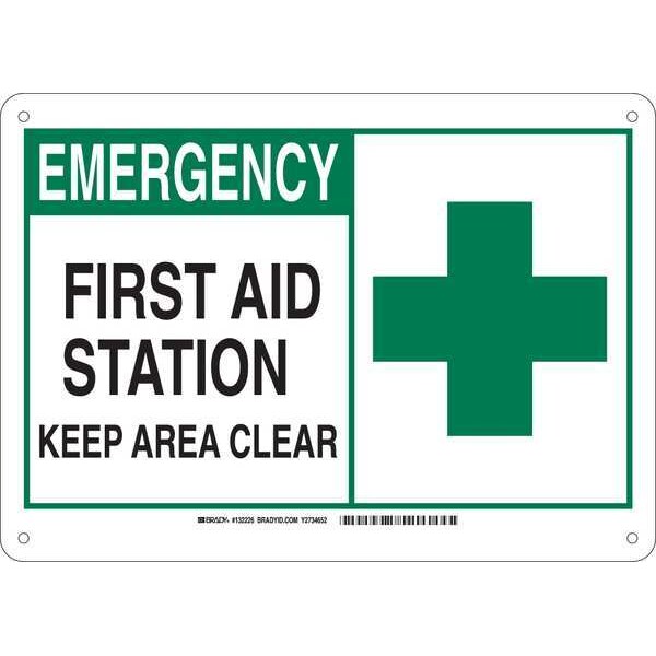 Safety Sign, Sign Subject Matter First Aid, Height 10 In., Width 14 In., Sign Material Aluminum, Sign Mounting Style With Mounting Holes, Header Emergency, Legend First Aid Station Keep Area Clear, Printed Language English, Sign Shape Rectangle