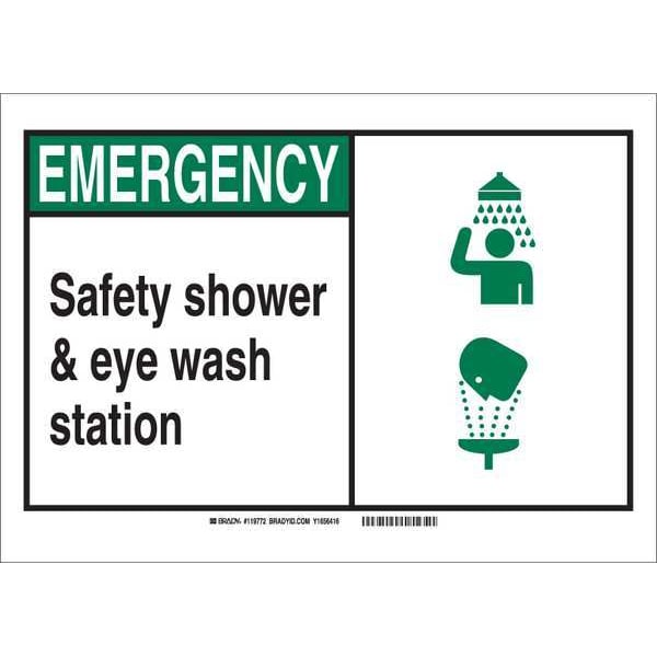 Office and Facility Sign, Sign Subject Matter Eyewash and Shower, Height 7 In., Width 10 In., Sign Material Polyester, Sign Mounting Style Adhesive Surface, Header Emergency, Legend Safety Shower and Eye Wash Station, Printed Language English, Sign Shape Rectangle