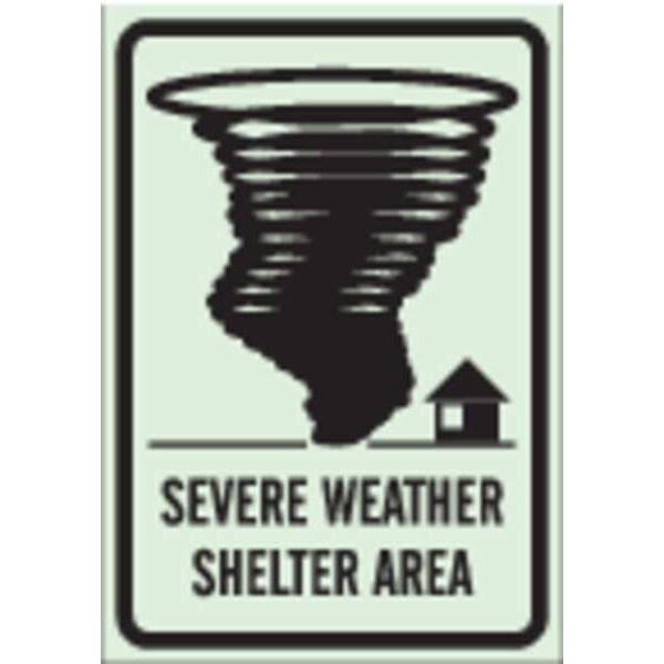 Emergency Sign, Sign Subject Matter Evacuation, Assembly or Shelter, Height 14 in, Width 10 in, Sign Material Polyester, Sign Mounting Style Adhesive Surface, Header No Header, Legend Severe Weather Shelter Area, Printed Language English, Sign Shape Rectangle
