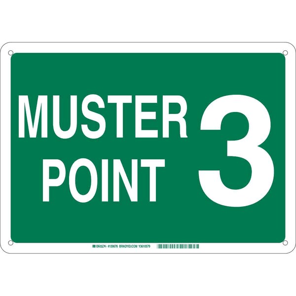 Emergency Assembly Sign, Sign Subject Matter Evacuation, Assembly or Shelter, Height 14 in, Width 20 in, Sign Material Plastic, Sign Mounting Style With Mounting Holes, Header No Header, Legend Muster Point 3, Printed Language English, Sign Shape Rectangle
