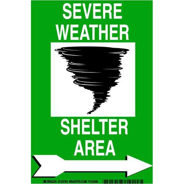 Emergency Sign, Sign Subject Matter Evacuation, Assembly or Shelter, Height 10 in, Width 7 in, Sign Material Polyester, Sign Mounting Style Adhesive Surface, Header No Header, Legend Severe Weather Shelter Area, Printed Language English, Sign Shape Rectangle