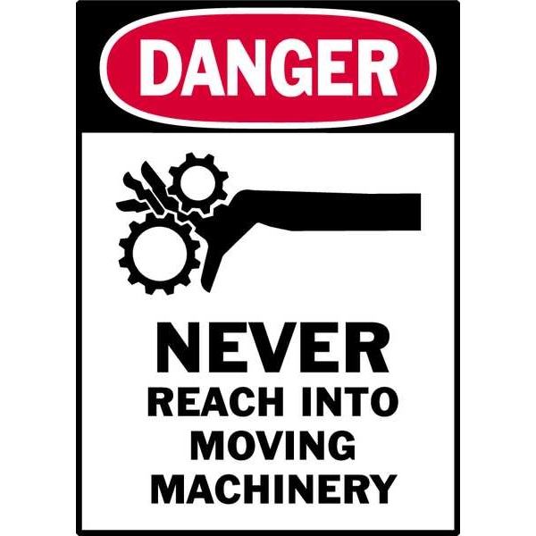 Label, Vertical Rectangle, Number of Printed Sides 1, English, Sign Legend NEVER REACH INTO MOVING MACHINERY, Sign Legend Style Text, Package Quantity 5