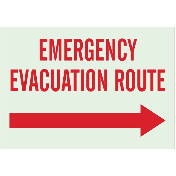 Emergency Exit Sign, Sign Subject Matter Evacuation, Assembly or Shelter, Height 10 in, Width 14 in, Sign Material Polyester, Sign Mounting Style Adhesive Surface, Header No Header, Legend Emergency Evacuation Route, Printed Language English, Sign Shape Rectangle