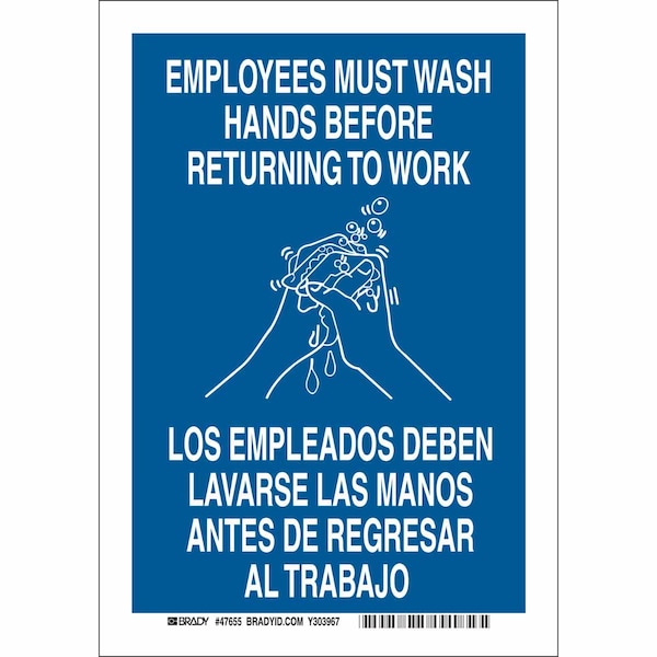 Facility Sign, Sign Subject Matter Wash Hands, Height 10 In., Width 7 In., Sign Material Aluminum, Sign Mounting Style With Mounting Holes, Header No Header, Legend Employees Must Wash Hands Before Returning To Work/Los Empleados Deben Lavarse Las Manos Antes De Regresar Al Trabajo, Printed Language English, Spanish, Sign Shape Rectangle