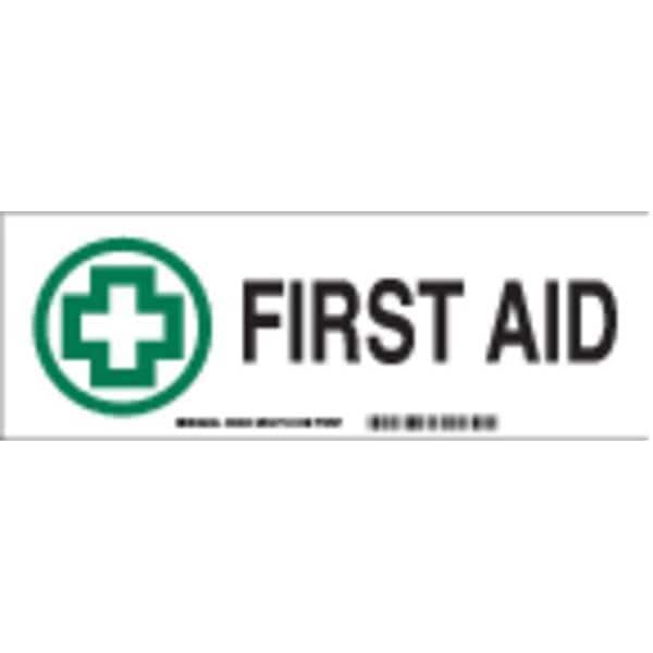 First Aid Sign, Sign Subject Matter First Aid, Height 3-1/2 In., Width 10 In., Sign Material Polyester, Sign Mounting Style Adhesive Surface, Header No Header, Legend First Aid, Printed Language English, Sign Shape Rectangle
