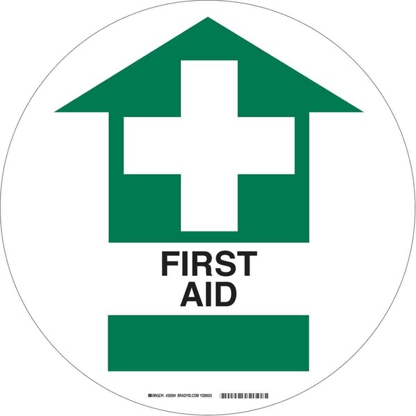 First Aid Sign, Sign Subject Matter First Aid, Height 17 In., Width 17 In., Sign Material Vinyl, Sign Mounting Style Adhesive Surface, Header No Header, Legend First Aid, Printed Language English, Sign Shape Circle